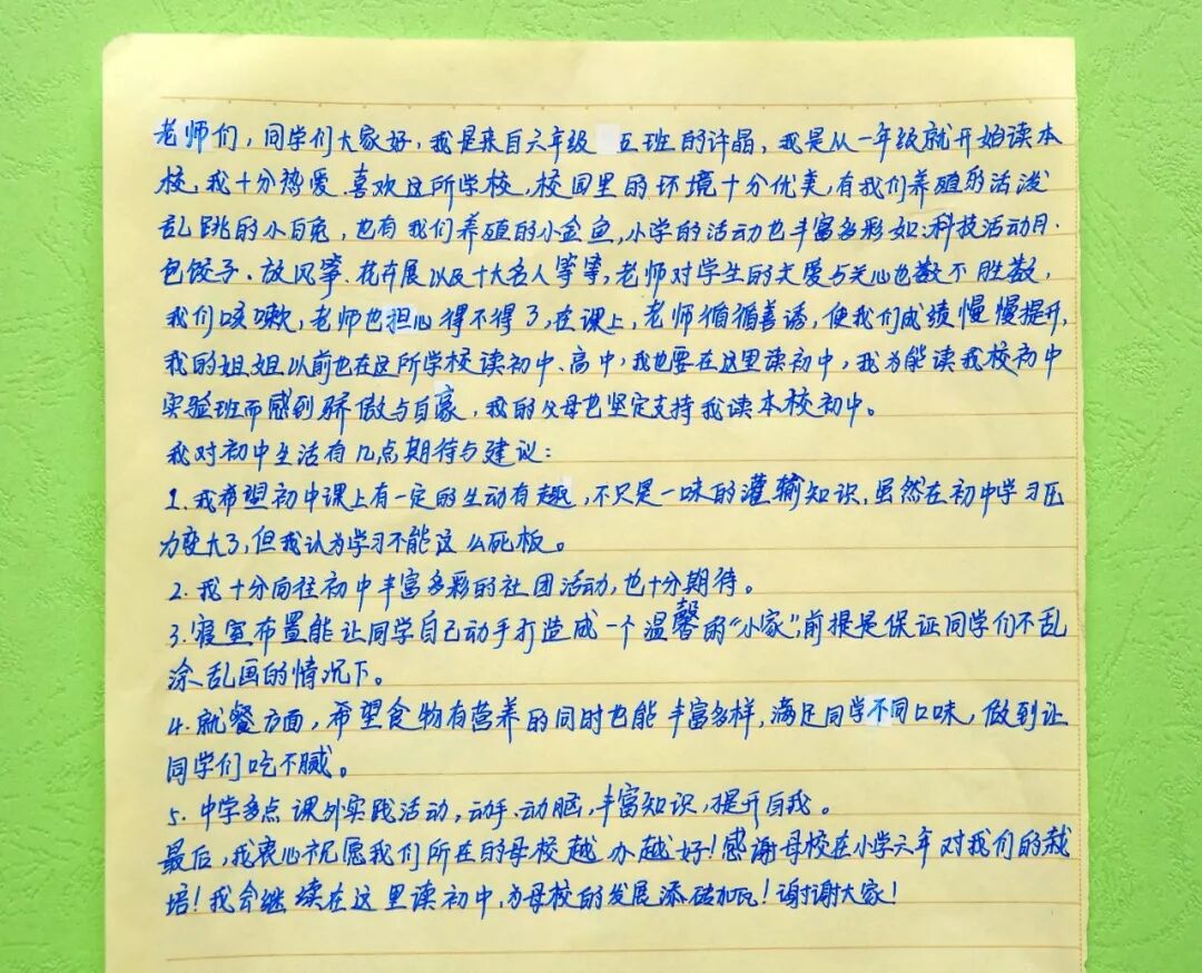 孩子们对母校有着深厚的感情,他们期待着即将开始的在母校初中部的学习与生活,他们说想时常看见陪伴着自己成长的小学老师们,他们热切地憧憬着遇见温和、亲切而博学的新老师,憧憬着精彩的课程与丰富多彩的社团活动,渴望着拥有更多的交流平台与展示自我的舞台,畅想着母校的美好未来。
