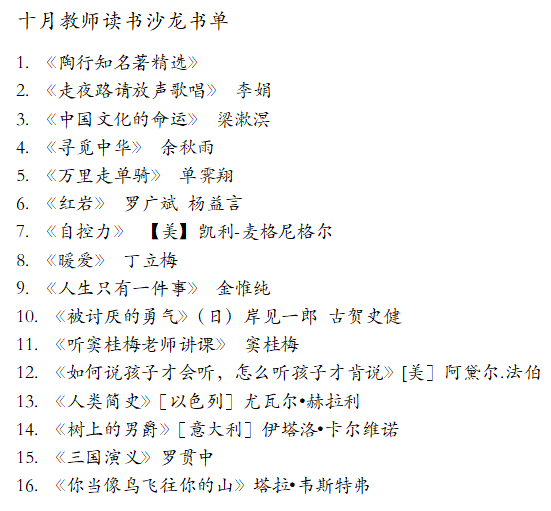 毛道生校长、程学琴副校长、许丽萍副校长和14位老师一起参加了此次读书沙龙活动。在这次读书沙龙活动中,大家一起分享了16本书,老师们分享的书籍不仅类型丰富(哲学类、文学类、小说类、散文类、历史类、文化类、家庭教育类名著类等),而且对书籍的阐述分享还有一定的深度和广度。